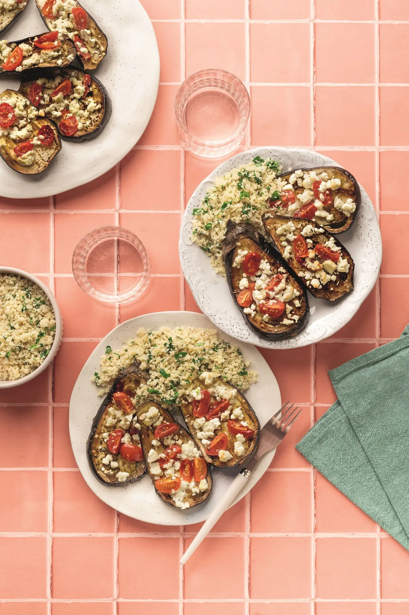 Die gebackenen Auberginen anrichten und zum Beispiel Kartoffeln, Basmatireis, Polenta oder Couscous dazu reichen.